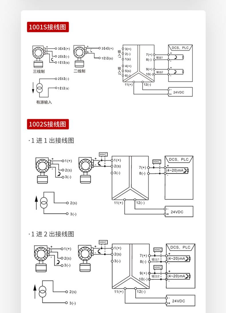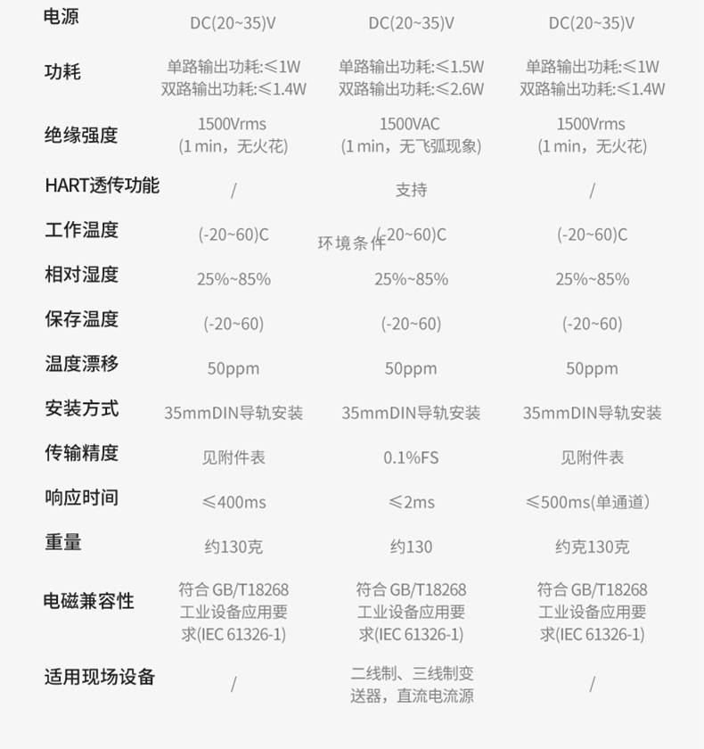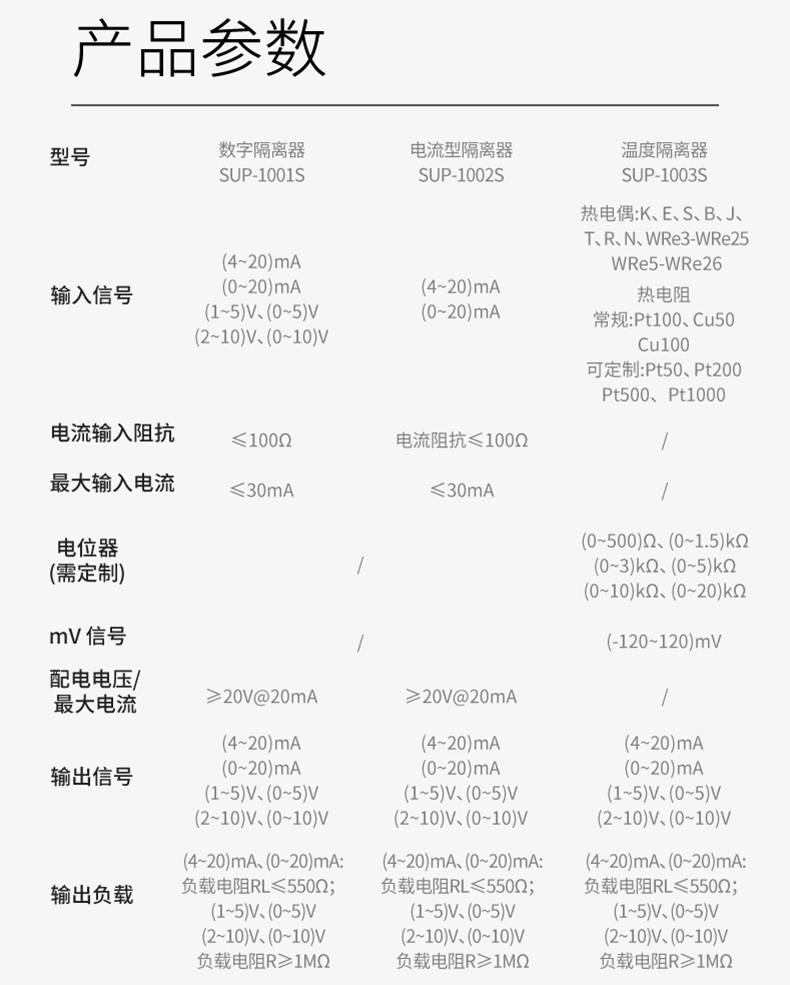 本产出输入电阻/电偶/毫伏信号,经过隔离 1:1 输出。输入端、输出端及电源端三端隔离。本产品为智能化设计,具备传统产品所不具备的多种功能。内部采用了数字化调校、无电位器、自动零点校准等先进技术。可与各类仪表及 DCS、PLC 配套使用。