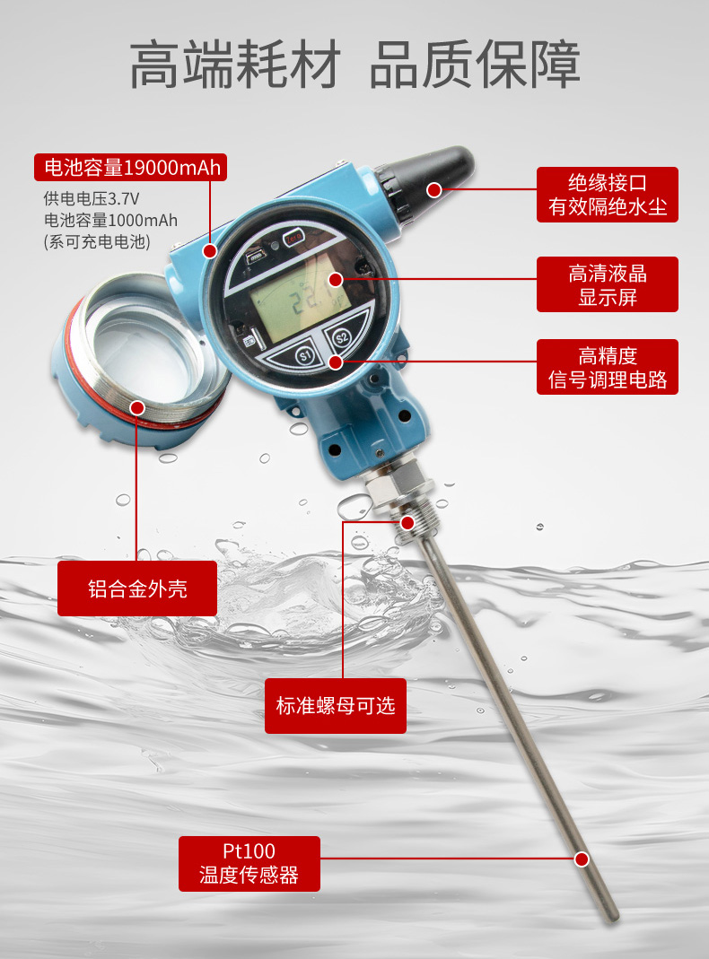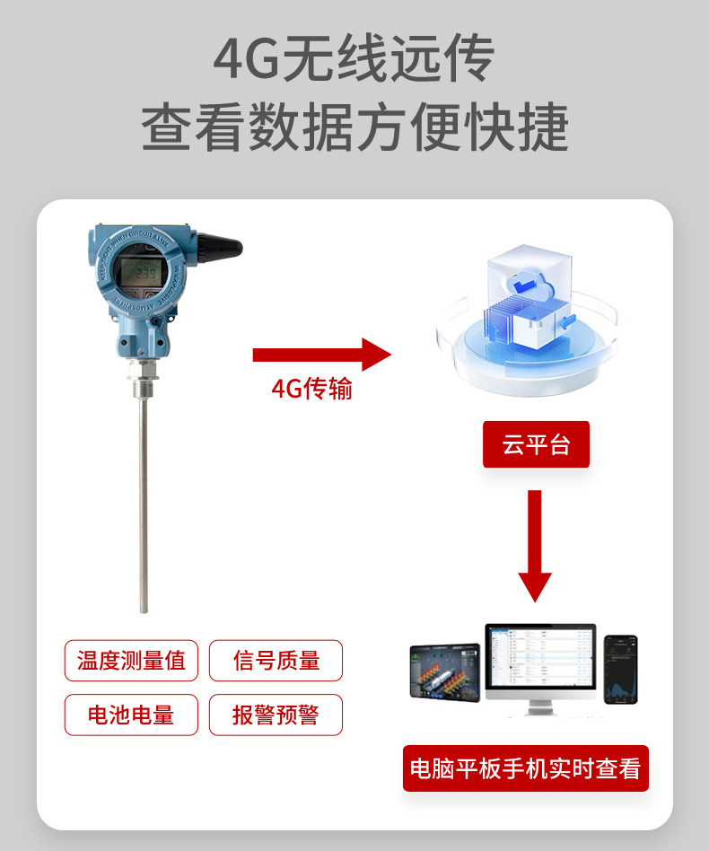 无线温度变送器是基于 4G 无线通讯网络使温度的测量、变送、上报为一体的低功耗智能仪表。产品采用 Pt100 温度传感器作为敏感元件,高精度信号调理电路,低功耗电池电源管理,丰富的 LCD 显示界面于一体,周期性上报温度测量值、电池电量、信号质量等数据,并且能够在温度超出设置范围时及时报警,提前预警故障隐患。 本产品适合油田、水利、消防管网、自来水管网、城市供热管网等智慧城市应用场景。