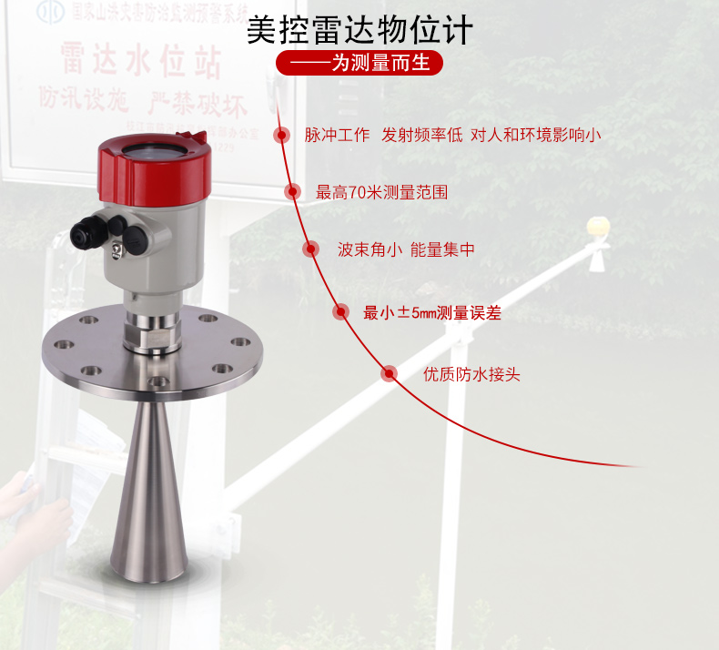 本产品波束能量低,对人体及环境均无伤害,还具有不受介质比重的影响、不受介电常数变化的影响、不需要现场校调等优点,广泛应用江河、水库、湖泊、灌渠、河道等自然水域水文监测场合。